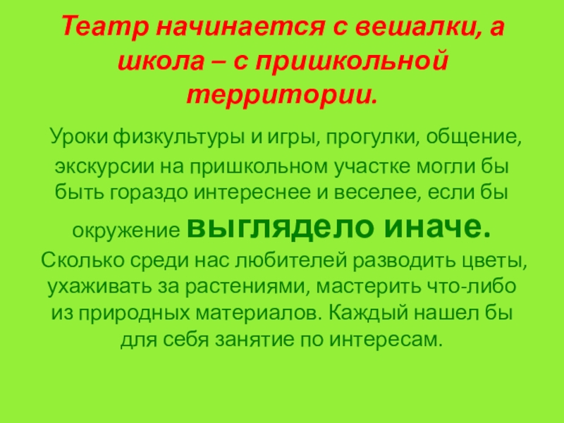 Слайд 5Театр начинается с вешалки, а школа – с пришкольной территории. Уроки