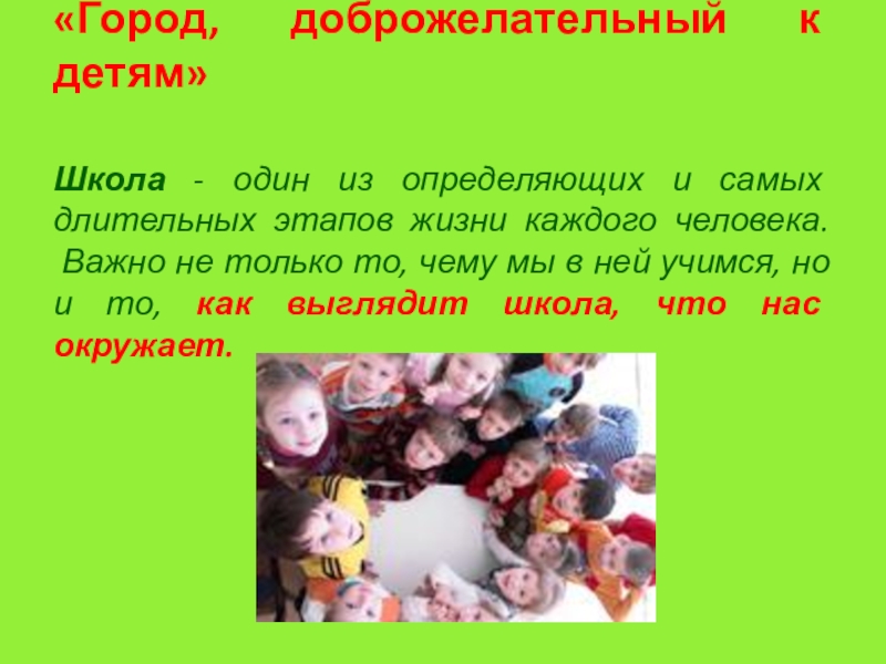 Слайд 2 «Город, доброжелательный к детям» Школа - один из определяющих и самых длительных