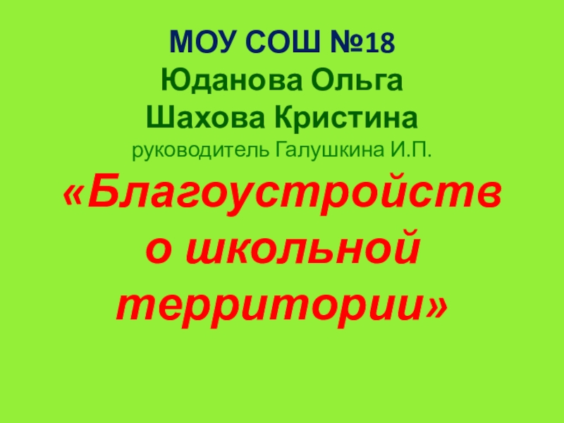 Слайд 1МОУ СОШ №18 Юданова Ольга Шахова Кристина руководитель Галушкина И.П. «Благоустройство школьной территории»