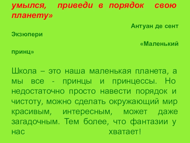 планету» Антуан де сент Экзюпери «Маленький принц» Школа – это наша маленькая планета, а мы все - принцы и принцессы. Но недостаточно просто навести порядок и чистоту, можно сделать окружающий мир красивым, интересным, может даже загадочным. Тем более, что фантазии у нас хватает!