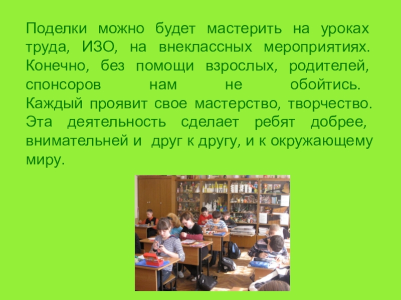 Слайд 14Поделки можно будет мастерить на уроках труда, ИЗО, на внеклассных мероприятиях.