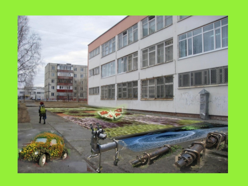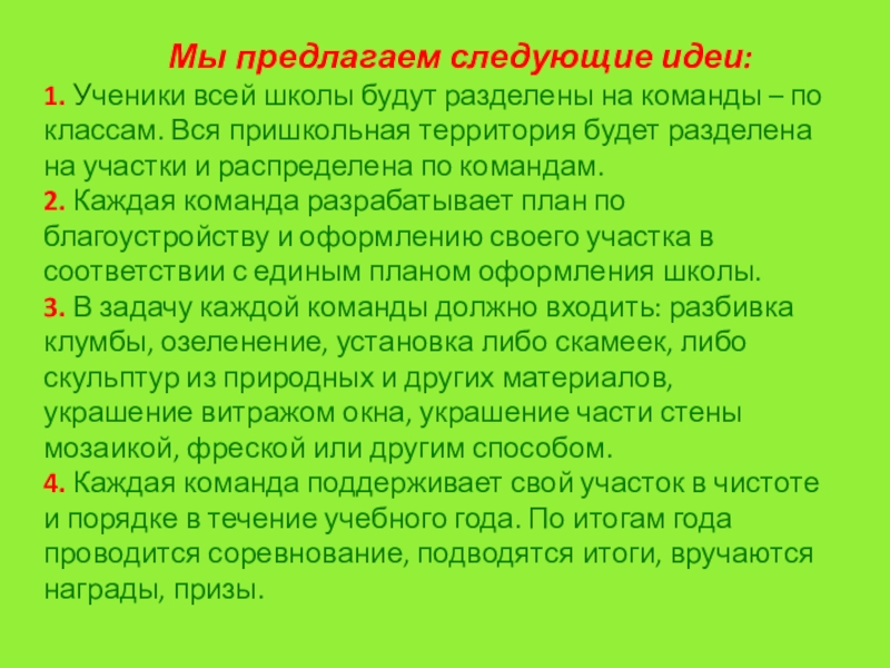 идеи: 1. Ученики всей школы будут разделены на команды – по классам. Вся пришкольная территория будет разделена на участки и распределена по командам. 2. Каждая команда разрабатывает план по благоустройству и оформлению своего участка в соответствии с единым планом оформления школы. 3. В задачу каждой команды должно входить: разбивка клумбы, озеленение, установка либо скамеек, либо скульптур из природных и других материалов, украшение витражом окна, украшение части стены мозаикой, фреской или другим способом. 4. Каждая команда поддерживает свой участок в чистоте и порядке в течение учебного года. По итогам года проводится соревнование, подводятся итоги, вручаются награды, призы.