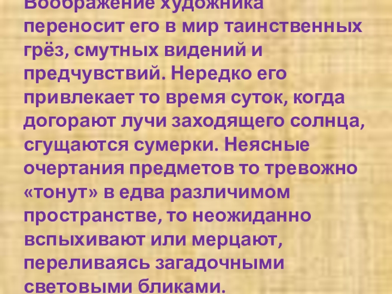 предчувствий. Нередко его привлекает то время суток, когда догорают лучи заходящего солнца, сгущаются сумерки. Неясные очертания предметов то тревожно «тонут» в едва различимом пространстве, то неожиданно вспыхивают или мерцают, переливаясь загадочными световыми бликами.