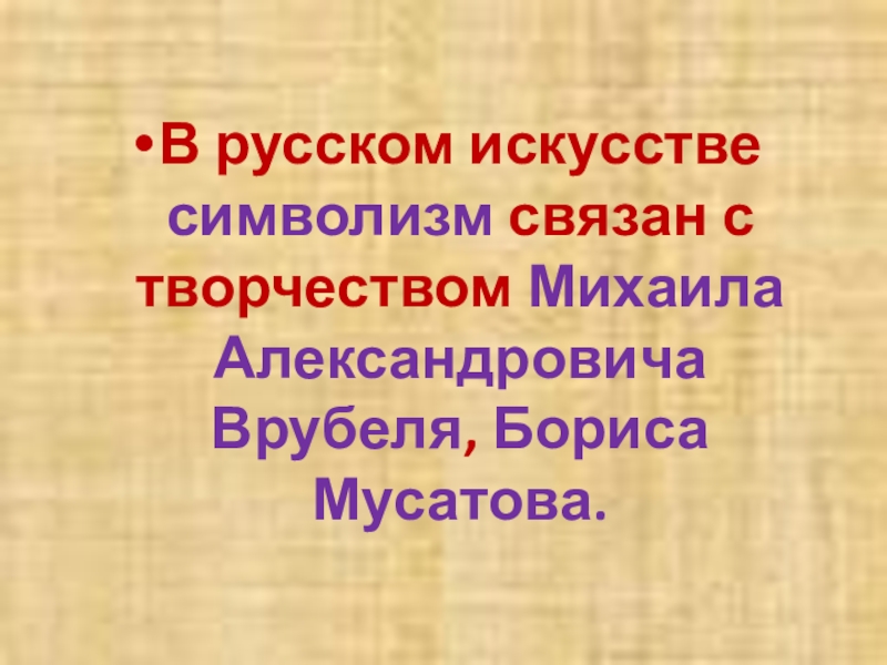 Слайд 2В русском искусстве символизм связан с творчеством Михаила Александровича Врубеля, Бориса