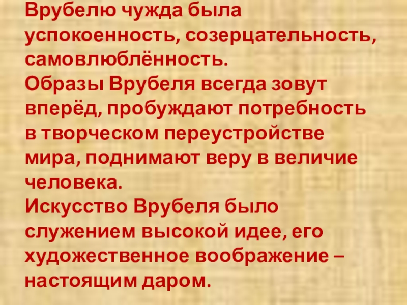Слайд 30Врубелю чужда была успокоенность, созерцательность, самовлюблённость.