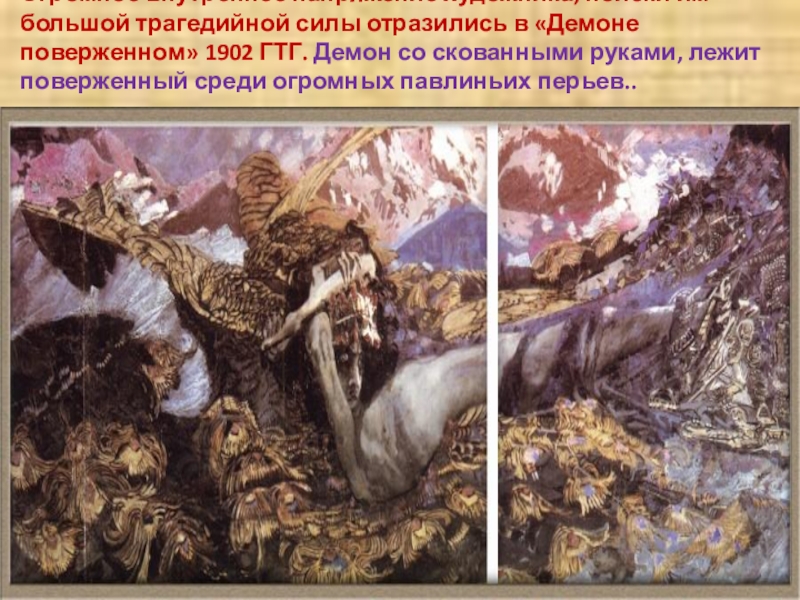 «Демоне поверженном» 1902 ГТГ. Демон со скованными руками, лежит поверженный среди огромных павлиньих перьев..