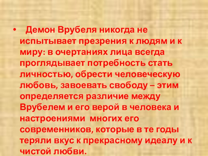 к миру: в очертаниях лица всегда проглядывает потребность стать личностью, обрести человеческую любовь, завоевать свободу – этим определяется различие между Врубелем и его верой в человека и настроениями многих его современников, которые в те годы теряли вкус к прекрасному идеалу и к чистой любви.