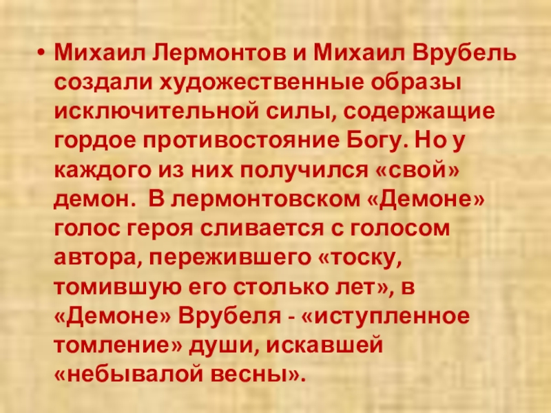 гордое противостояние Богу. Но у каждого из них получился «свой» демон. В лермонтовском «Демоне» голос героя сливается с голосом автора, пережившего «тоску, томившую его столько лет», в «Демоне» Врубеля - «иступленное томление» души, искавшей «небывалой весны».