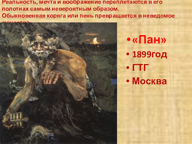 Налёт таинственности, загадочности в воплощении этих тем («Пан» -1899г) сближает его творчество с установками представителей символизма.