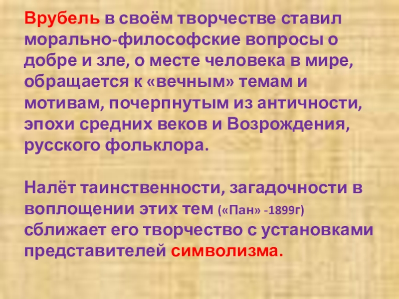 Слайд 5Врубель в своём творчестве ставил морально-философские вопросы о добре и зле,