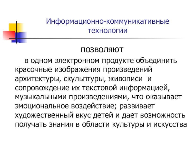 произведений архитектуры, скульптуры, живописи и сопровождение их текстовой информацией, музыкальными произведениями, что оказывает эмоциональное воздействие; развивает художественный вкус детей и дает возможность получать знания в области культуры и искусства