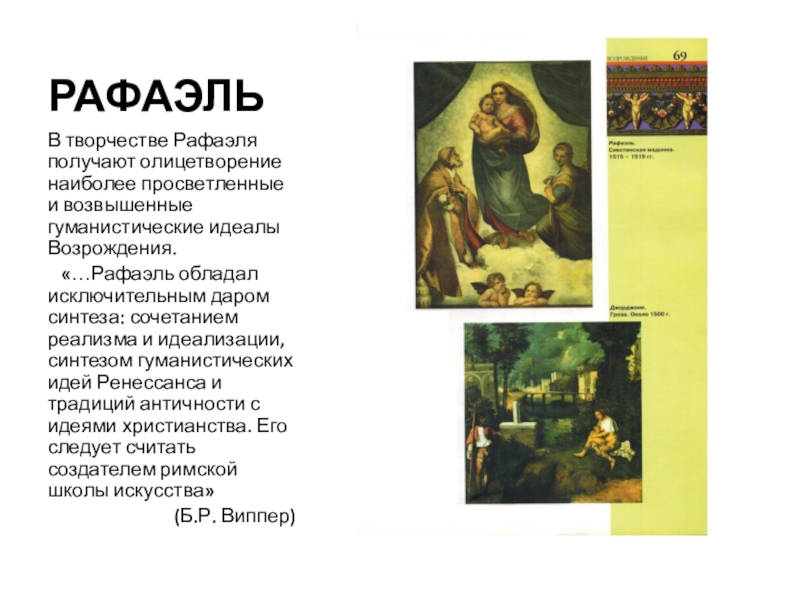 «…Рафаэль обладал исключительным даром синтеза: сочетанием реализма и идеализации, синтезом гуманистических идей Ренессанса и традиций античности с идеями христианства. Его следует считать создателем римской школы искусства»