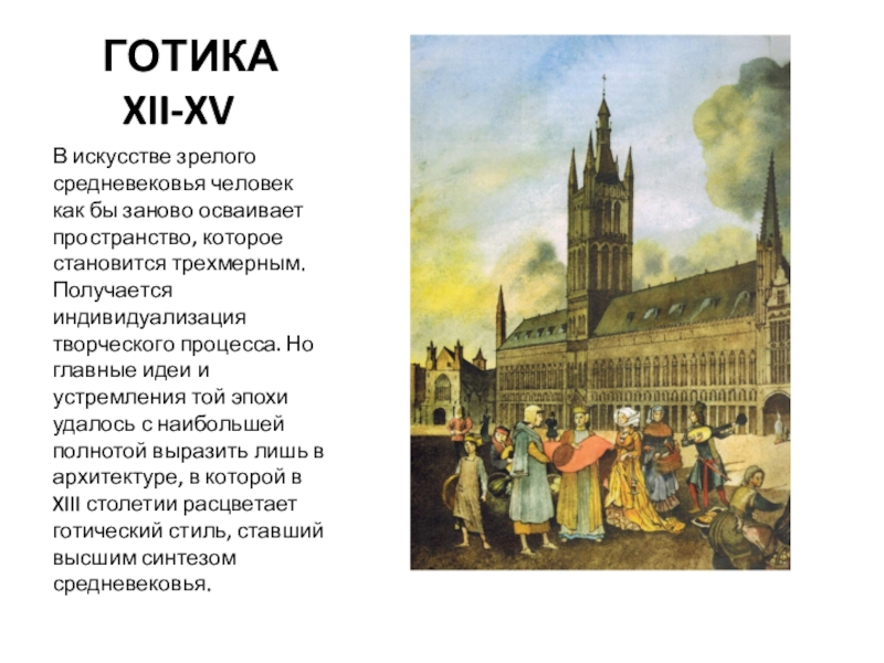 средневековья человек как бы заново осваивает пространство, которое становится трехмерным. Получается индивидуализация творческого процесса. Но главные идеи и устремления той эпохи удалось с наибольшей полнотой выразить лишь в архитектуре, в которой в XIII столетии расцветает готический стиль, ставший высшим синтезом средневековья.