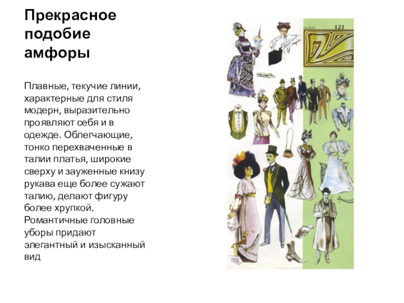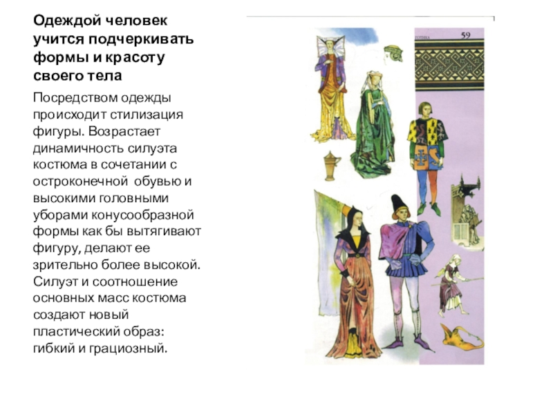 стилизация фигуры. Возрастает динамичность силуэта костюма в сочетании с остроконечной обувью и высокими головными уборами конусообразной формы как бы вытягивают фигуру, делают ее зрительно более высокой. Силуэт и соотношение основных масс костюма создают новый пластический образ: гибкий и грациозный.