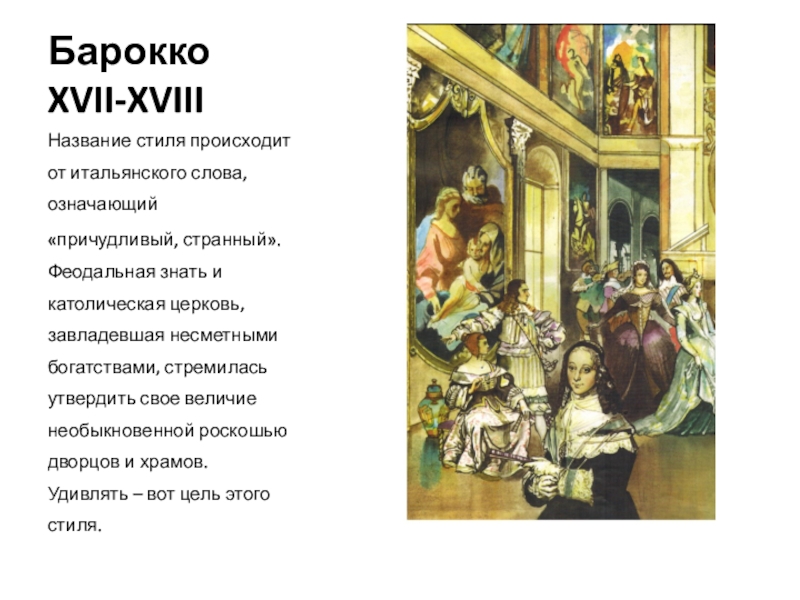 Феодальная знать и католическая церковь, завладевшая несметными богатствами, стремилась утвердить свое величие необыкновенной роскошью дворцов и храмов. Удивлять – вот цель этого стиля.