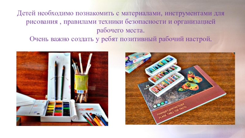 Слайд 9Детей необходимо познакомить с материалами, инструментами для рисования , правилами техники