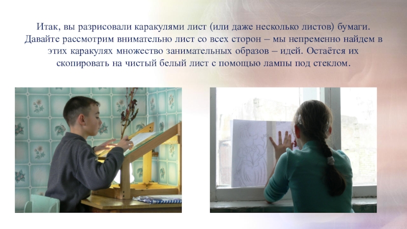 рассмотрим внимательно лист со всех сторон – мы непременно найдем в этих каракулях множество занимательных образов – идей. Остаётся их скопировать на чистый белый лист с помощью лампы под стеклом.