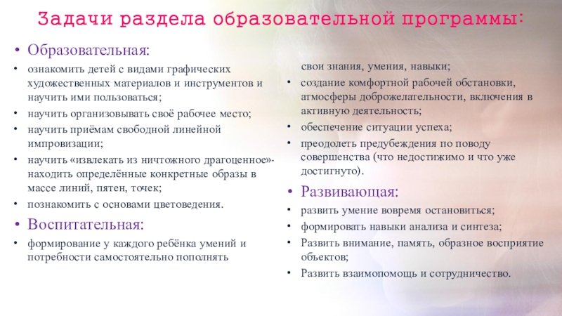 - свободно рисовать и импровизировать в рисовании – свободно владеть художественными выразительными средствами: линией, пятном, точкой;