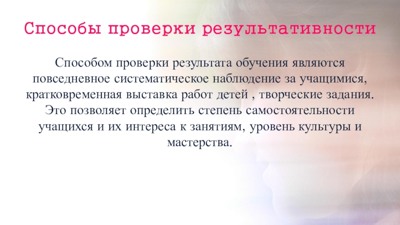учащимися, кратковременная выставка работ детей , творческие задания. Это позволяет определить степень самостоятельности учащихся и их интереса к занятиям, уровень культуры и мастерства.