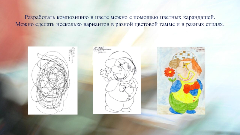 Слайд 15Разработать композицию в цвете можно с помощью цветных карандашей.