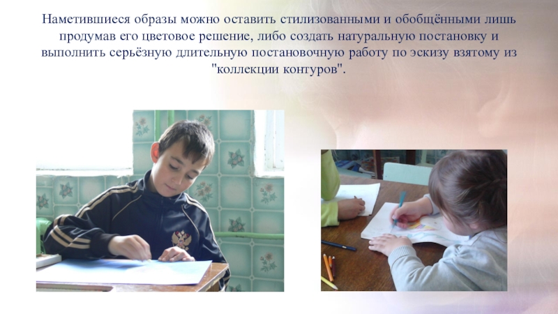 Слайд 16Наметившиеся образы можно оставить стилизованными и обобщёнными лишь продумав его цветовое