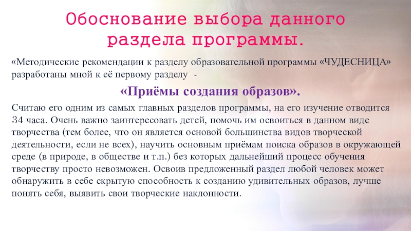 Считаю его одним из самых главных разделов программы, на его изучение отводится 34 часа. Очень важно заинтересовать детей, помочь им освоиться в данном виде творчества (тем более, что он является основой большинства видов творческой деятельности, если не всех), научить основным приёмам поиска образов в окружающей среде (в природе, в обществе и т.п.) без которых дальнейший процесс обучения творчеству просто невозможен. Освоив предложенный раздел любой человек может обнаружить в себе скрытую способность к созданию удивительных образов, лучше понять себя, выявить свои творческие наклонности.