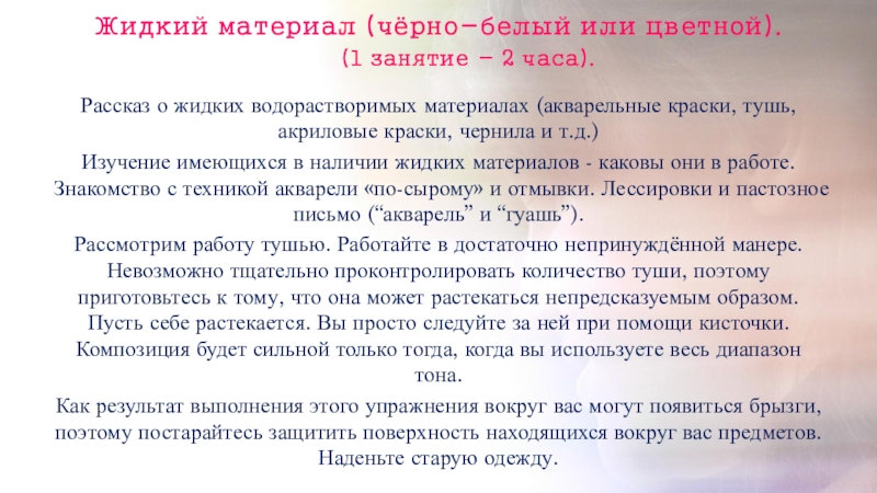 Изучение имеющихся в наличии жидких материалов - каковы они в работе. Знакомство с техникой акварели «по-сырому» и отмывки. Лессировки и пастозное письмо (“акварель” и “гуашь”).