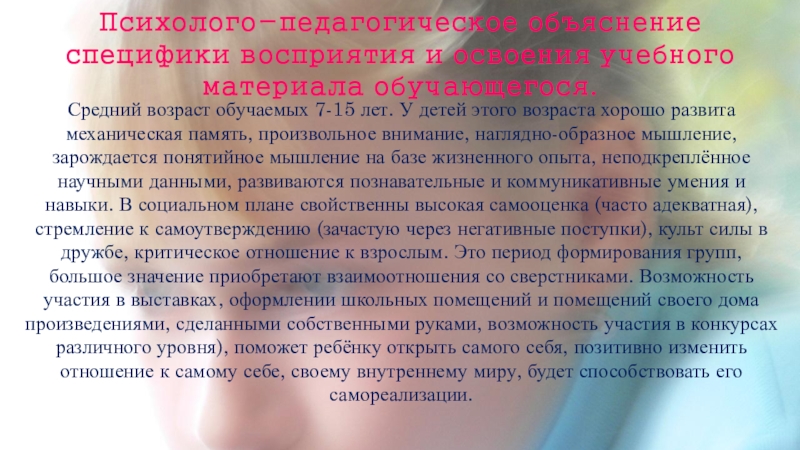 7-15 лет. У детей этого возраста хорошо развита механическая память, произвольное внимание, наглядно-образное мышление, зарождается понятийное мышление на базе жизненного опыта, неподкреплённое научными данными, развиваются познавательные и коммуникативные умения и навыки. В социальном плане свойственны высокая самооценка (часто адекватная), стремление к самоутверждению (зачастую через негативные поступки), культ силы в дружбе, критическое отношение к взрослым. Это период формирования групп, большое значение приобретают взаимоотношения со сверстниками. Возможность участия в выставках, оформлении школьных помещений и помещений своего дома произведениями, сделанными собственными руками, возможность участия в конкурсах различного уровня), поможет ребёнку открыть самого себя, позитивно изменить отношение к самому себе, своему внутреннему миру, будет способствовать его самореализации.
