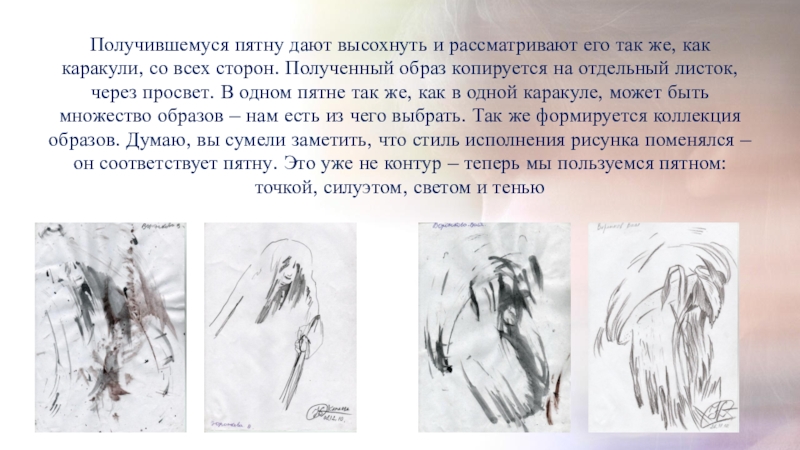 со всех сторон. Полученный образ копируется на отдельный листок, через просвет. В одном пятне так же, как в одной каракуле, может быть множество образов – нам есть из чего выбрать. Так же формируется коллекция образов. Думаю, вы сумели заметить, что стиль исполнения рисунка поменялся – он соответствует пятну. Это уже не контур – теперь мы пользуемся пятном: точкой, силуэтом, светом и тенью