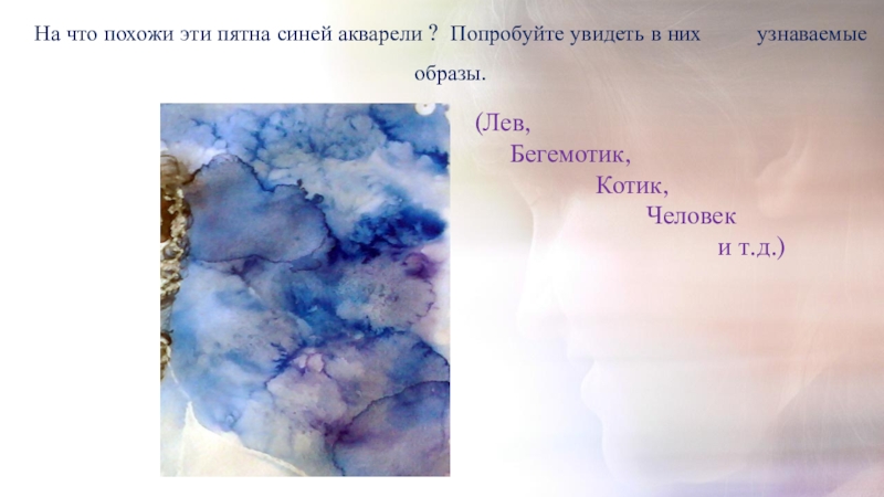 Слайд 22На что похожи эти пятна синей акварели ? Попробуйте увидеть в