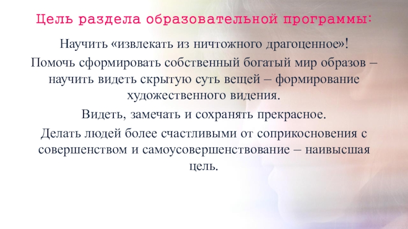 мир образов – научить видеть скрытую суть вещей – формирование художественного видения.