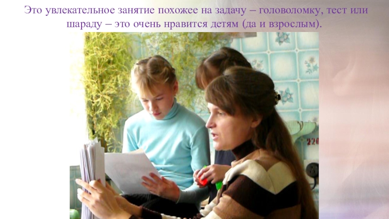 Слайд 14Это увлекательное занятие похожее на задачу – головоломку, тест или шараду