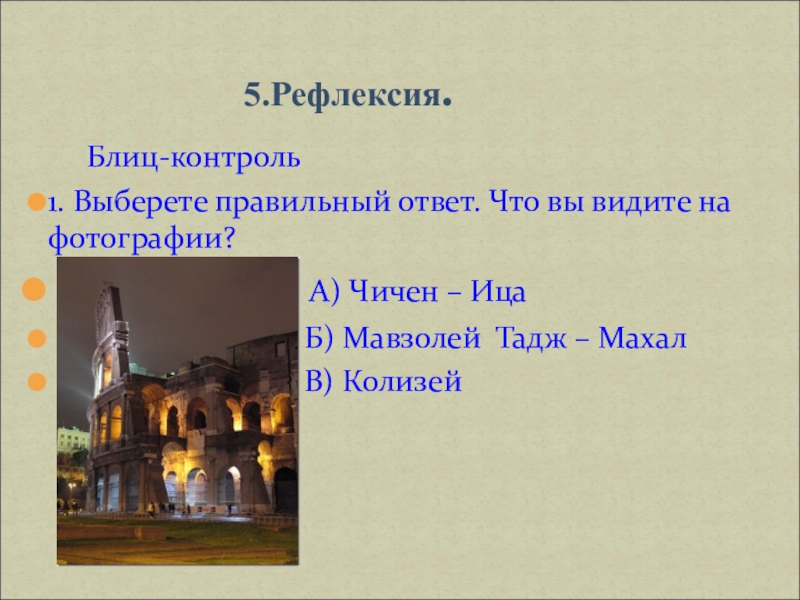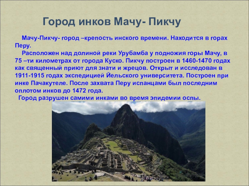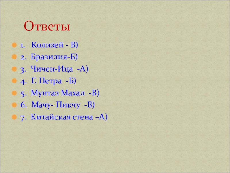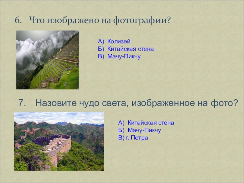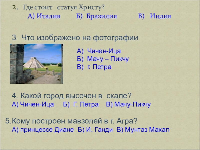 А) Чичен-Ица Б) Г. Петра В) Мачу-Пикчу