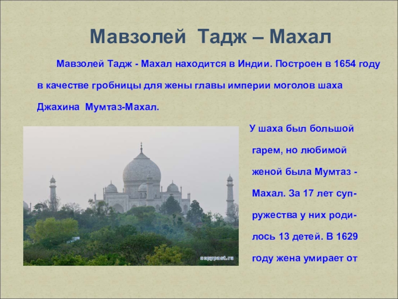 А) принцессе Диане Б) И. Ганди В) Мунтаз Махал