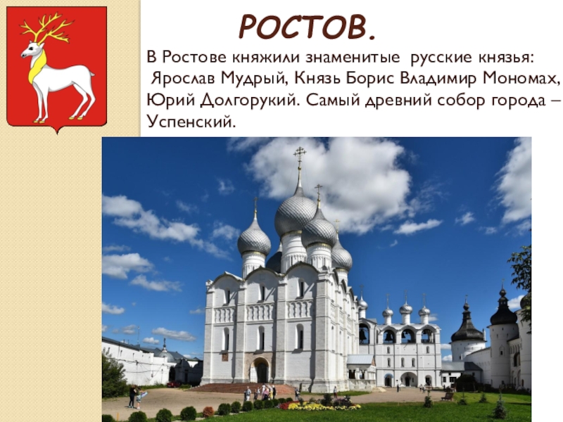 рОСТОВ.В Ростове княжили знаменитые русские князья: Ярослав Мудрый, Князь Борис Владимир Мономах, Юрий Долгорукий. Самый древний собор