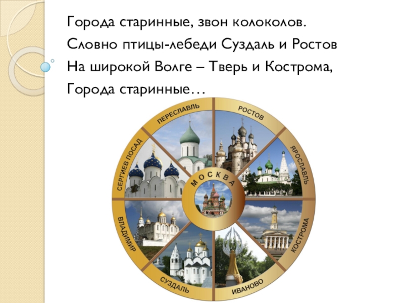 Города старинные, звон колоколов.Словно птицы-лебеди Суздаль и РостовНа широкой Волге – Тверь и Кострома,Города старинные…