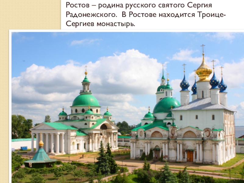 Слайд 8Ростов – родина русского святого Сергия Радонежского. В Ростове находится Троице-Сергиев
