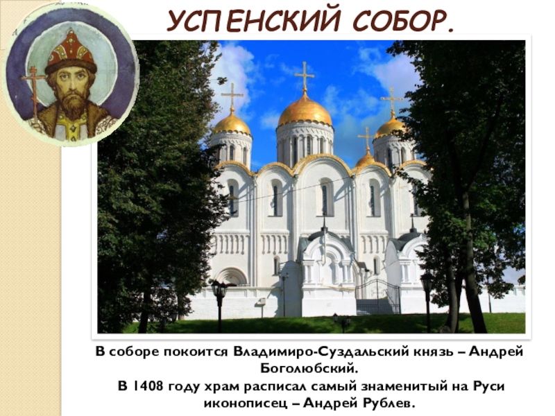 Успенский собор.В соборе покоится Владимиро-Суздальский князь – Андрей Боголюбский. В 1408 году храм расписал самый знаменитый на