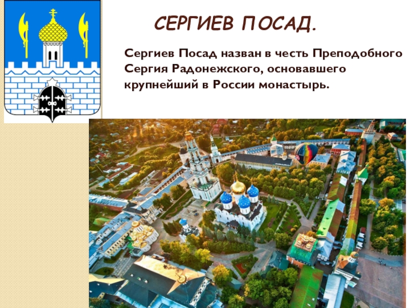 Сергиев Посад.Сергиев Посад назван в честь Преподобного Сергия Радонежского, основавшего крупнейший в России монастырь.