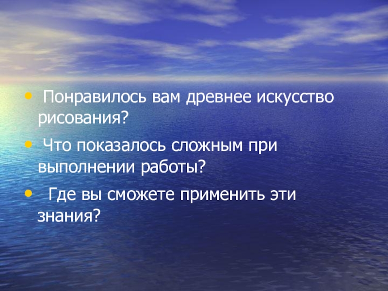 Понравилось вам древнее искусство рисования? Что показалось сложным при выполнении работы? Где вы сможете применить эти
