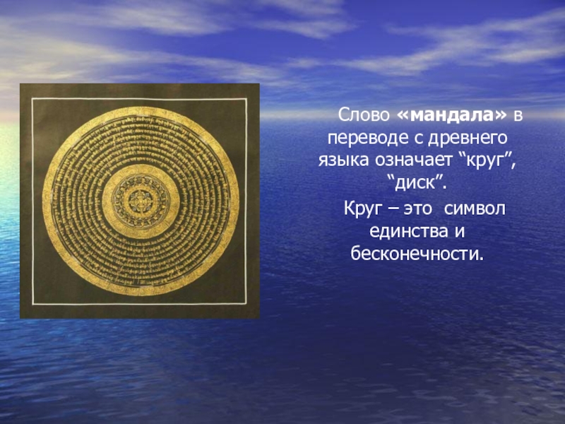 Слово «мандала» в переводе с древнего языка означает “круг”, “диск”. Круг – это символ единства и бесконечности.