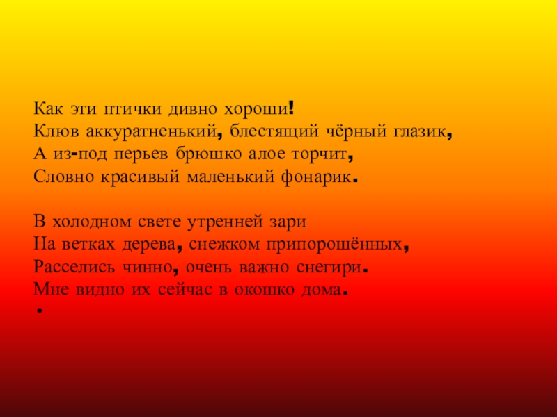 Как эти птички дивно хороши!Клюв аккуратненький, блестящий чёрный глазик,А из-под перьев брюшко алое торчит,Словно красивый маленький фонарик. В холодном свете утренней зариНа ветках дерева, снежком припорошённых,Расселись чинно, очень важно снегири.Мне видно их сейчас в окошко дома.