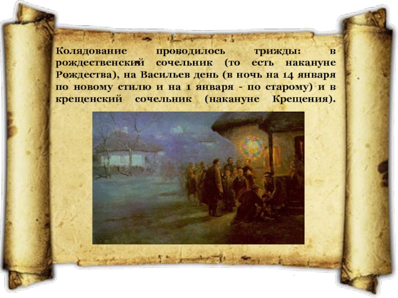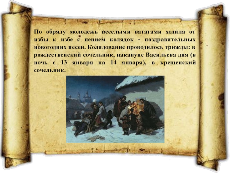 пением колядок - поздравительных новогодних песен. Колядование проводилось трижды: в рождественский сочельник, накануне Васильева дня (в ночь с 13 января на 14 января), в крещенский сочельник.