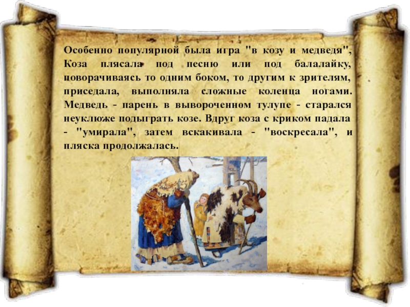 Слайд 16Особенно популярной была игра "в козу и медведя", Коза плясала под
