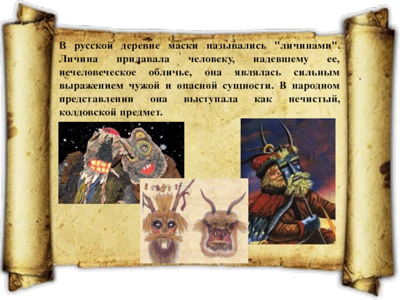 Слайд 17В русской деревне маски назывались "личинами". Личина придавала человеку, надевшему ее,