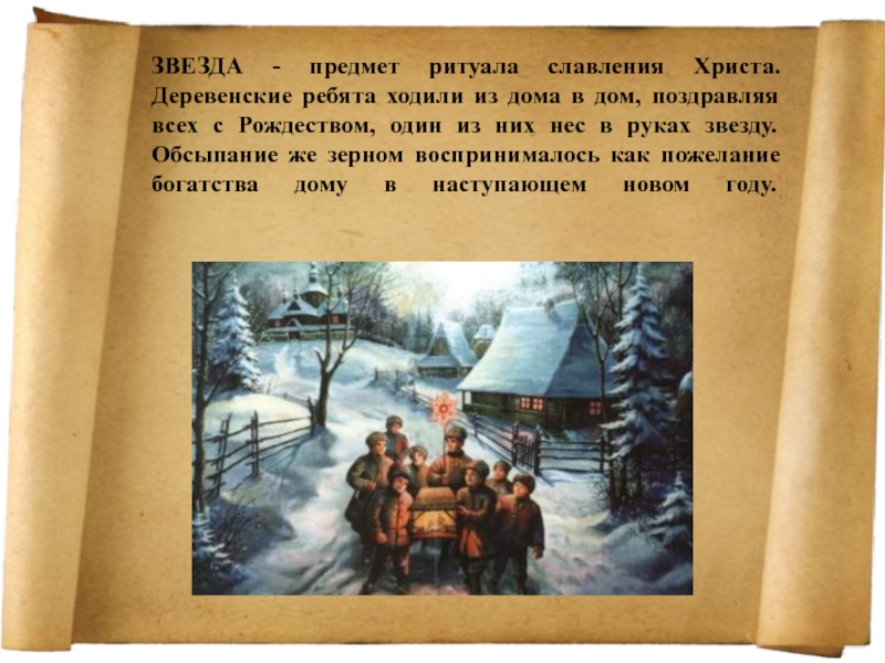 Слайд 12ЗВЕЗДА - предмет ритуала славления Христа. Деревенские ребята ходили из дома