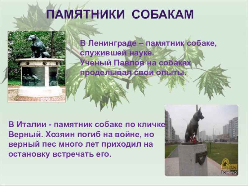 В Италии - памятник собаке по кличке Верный. Хозяин погиб на войне, но верный пес много лет приходил на остановку встречать его.