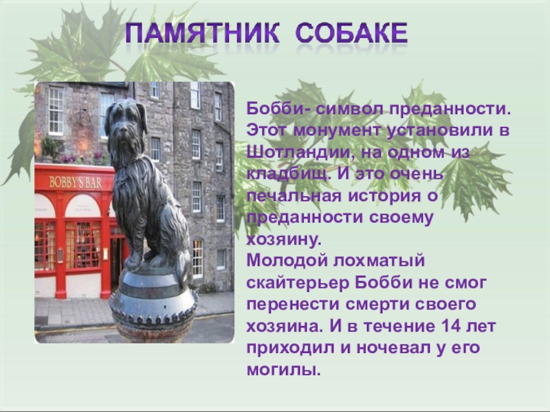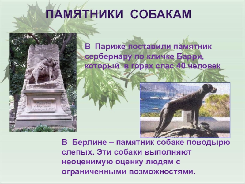 В Берлине – памятник собаке поводырю слепых. Эти собаки выполняют неоценимую оценку людям с ограниченными возможностями.