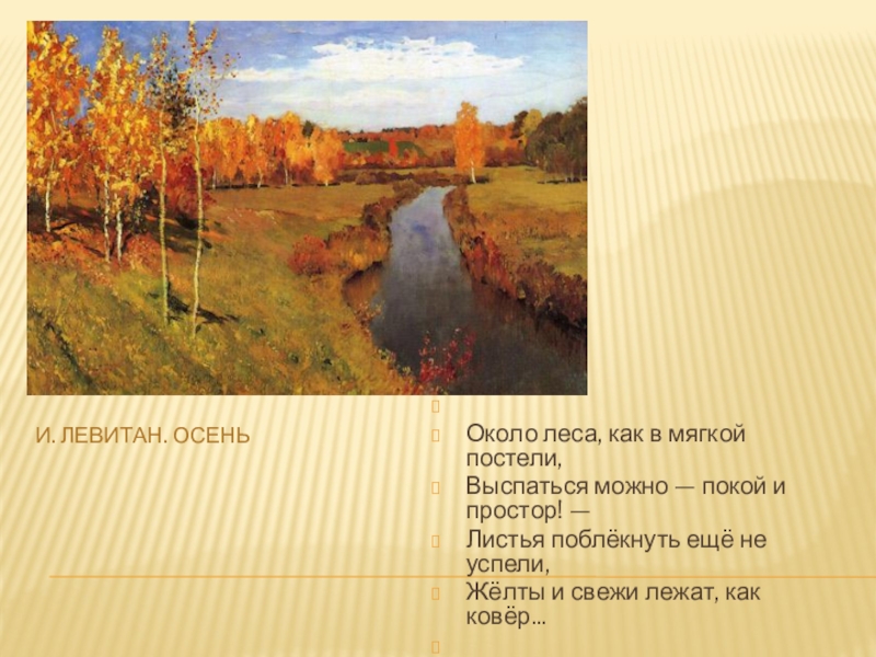 И. Левитан. Осень                                 Около леса, как в мягкой постели,Выспаться можно — покой и простор! —Листья поблёкнуть ещё не