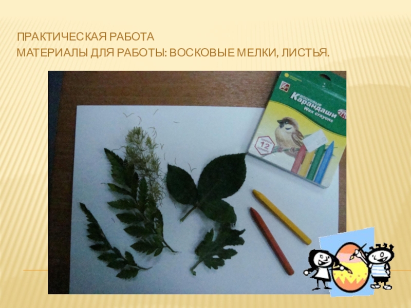 Практическая работаМатериалы для работы: восковые мелки, листья.